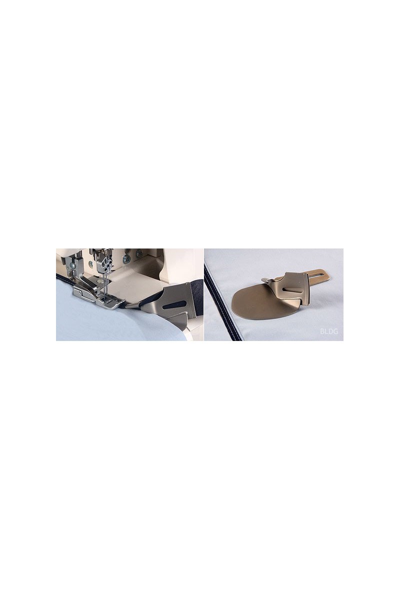 Le pose-biais pli unique permet d'entourer, de manière très rapide et très précise, les bords de tissus ou des encolures par point de recouvrement ou point de chaînette double avec biais, le dessus du biais étant doublement rabattus et le dessous restant ouvert.